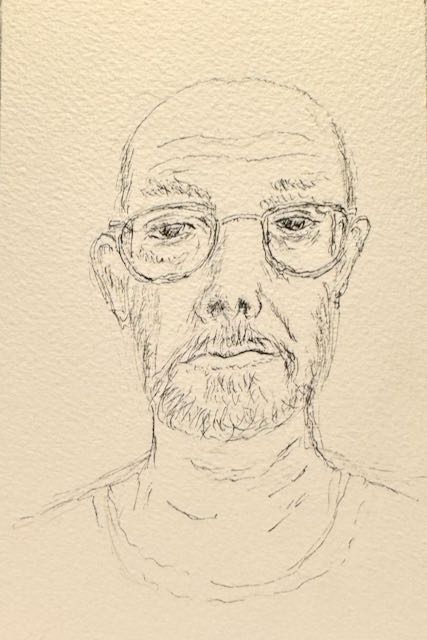 I don’t think this looks like me but Joy thinks it’s better than most of my self portraits thus far. It’s a basic transcription of the photo I took of myself moments before. Since I am getting better at copying, I suppose it is my likeness. I intend to increasingly abstract my facial features in subsequent sketches. We’ll see how it goes.